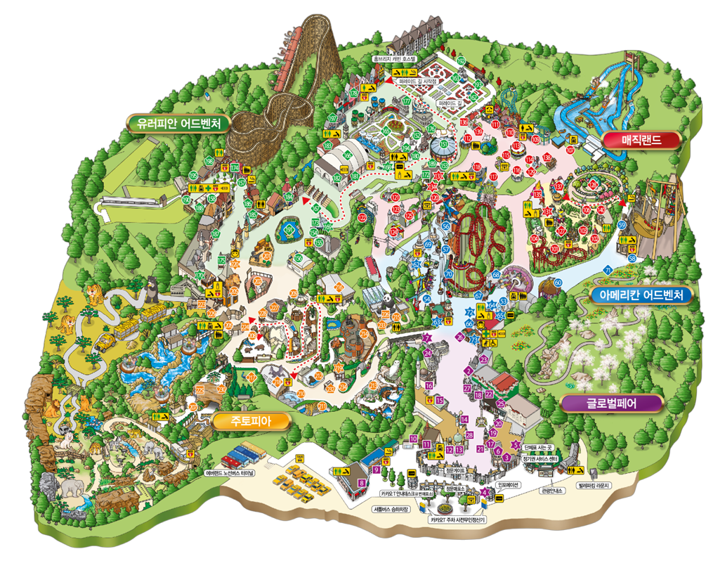에버랜드는 지도에서 보듯 같이 크게 다섯 개 구역으로 나누어져 있습니다. 글로벌 페어, 매직랜드, 유러피안 어드벤처, 주토피아 순으로 차례차례 살펴보겠습니다.