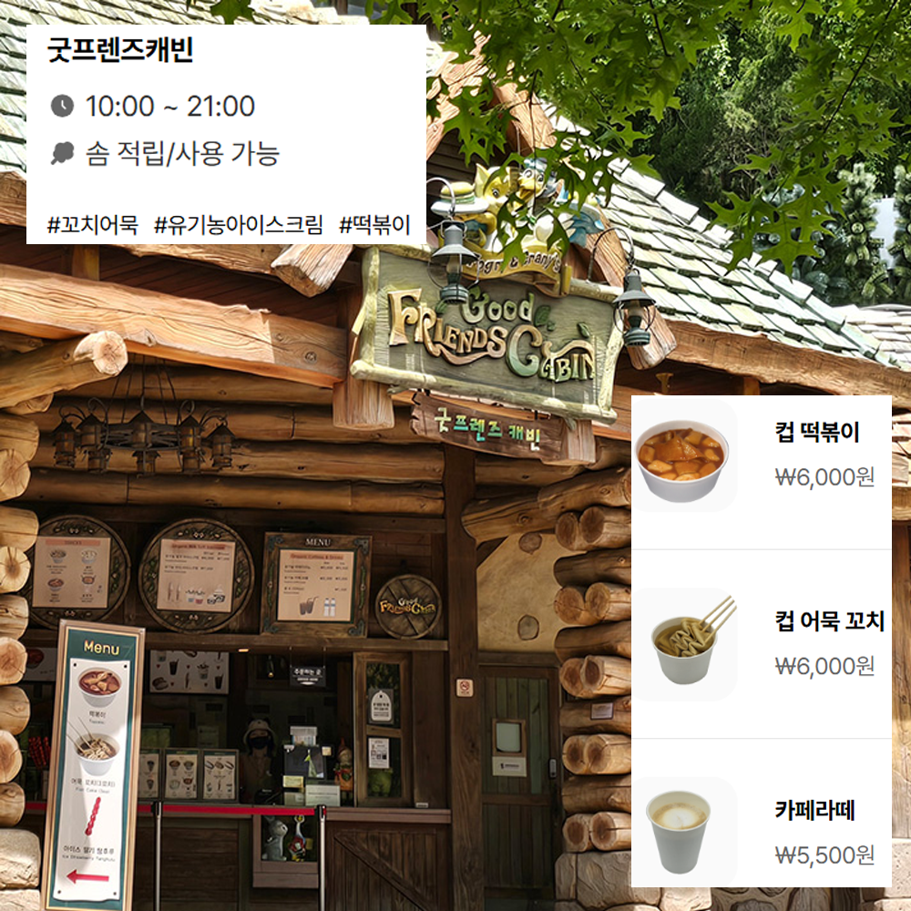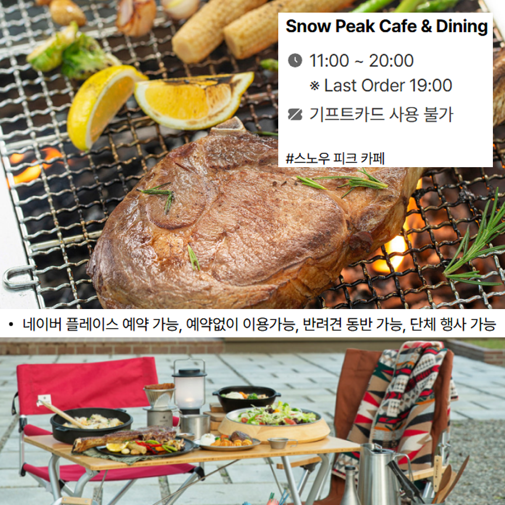 마지막으로 에버랜드 인근 지역에서는 스노우 피크 카페(Snow Peak Cafe & Dining)이라는 캠핑 컨셉의 이색 레스토랑이 있습니다. 이곳에서는 캠핑 플레이트 세트(22,000원)를 즐길 수 있으며, 조용한 공간에서 가족과 여유롭게 식사하기 좋습니다.