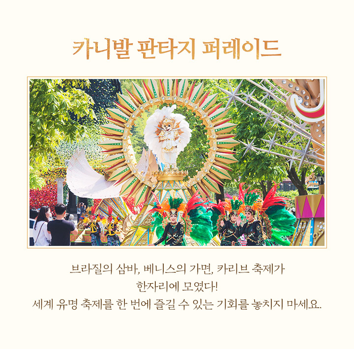 - 설명: 에버랜드에 방문했다면 절대 놓쳐선 안 될 화려한 낮 공연입니다. 브라질 삼바의 열정, 베니스 가면축제의 화려함, 카리브해의 리듬까지 세계 각국의 대표 축제 테마가 하나의 퍼레이드로 펼쳐지는 이 공연은 아이부터 어른까지 모두를 사로잡는 에버랜드만의 글로벌 축제 쇼입니다.