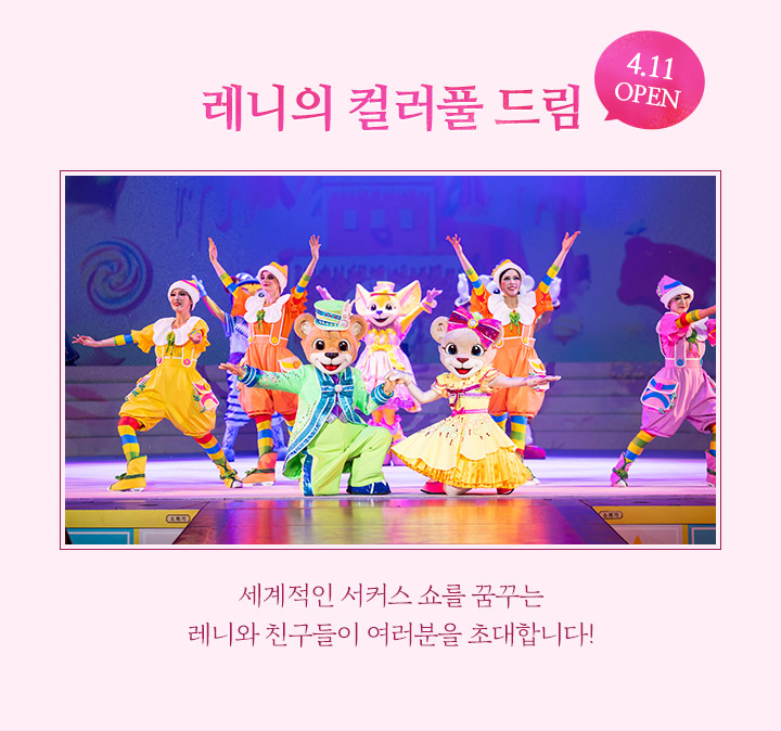 - 설명: 에버랜드의 마스코트 레니가 주인공이 되어 펼치는 환상의 뮤지컬입니다. 이 공연은 레니가 서커스 스타를 꿈꾸며 펼치는 성장 이야기를 테마로, 아이들의 상상력을 자극하고 희망과 용기를 전하는 어린이 맞춤형 라이브 퍼포먼스입니다. 예쁜 조명과 알록달록한 무대, 다양한 캐릭터의 등장으로 아이들의 시선을 사로잡는 이 공연은 어린이뿐만 아니라 가족 모두가 편안하게 감상할 수 있는 힐링 공연이기도 하죠.
