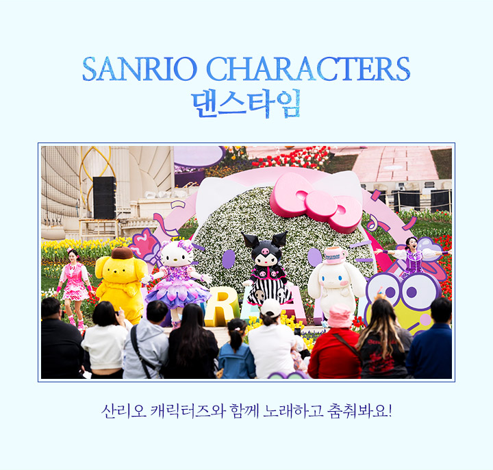 - 설명: 산리오의 인기 캐릭터들이 직접 무대에 등장해 관람객들과 함께 신나는 음악에 맞춰 춤을 추는 참여형 댄스 공연입니다. 헬로키티, 쿠로미, 마이멜로디, 시나모롤 등 사랑스러운 산리오 친구들이 총출동하며, 캐릭터별로 다른 테마의 댄스곡에 맞춰 아이들과 가족 모두가 즐길 수 있는 유쾌한 퍼포먼스가 펼쳐집니다.