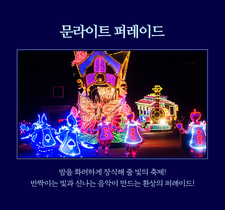 - 설명: 하루의 끝을 장식하는 에버랜드의 대표 야간 퍼레이드로, 낮과는 또 다른 마법 같은 분위기를 선사하는 특별한 시간입니다. 형형색색의 조명, 화려한 LED 코스튬, 그리고 생동감 넘치는 음악이 어우러져 아이부터 어른까지 모두를 매료시키는 야간 퍼포먼스죠. 에버랜드에 왔다면 꼭 봐야 할 핵심 콘텐츠 중 하나로, 특히, 연인, 가족, 친구 단위 방문객 모두에게 추천되는 인기 프로그램입니다.