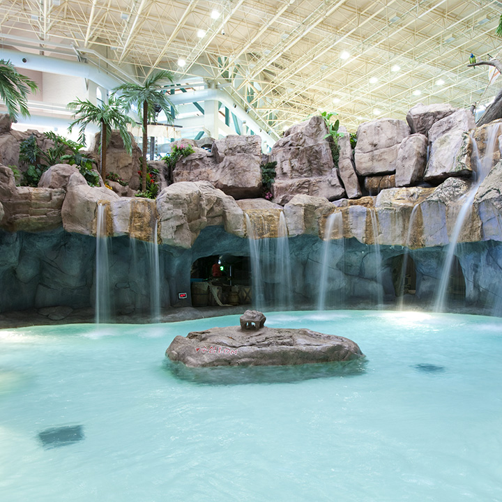 해골 물폭포가 유명한 어드벤처풀, 실제 파도에 도전하는 서핑라이드, 동굴 콘셉트의 케이브 스파 등 다양하죠.