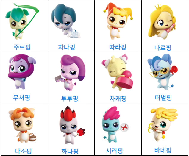 - 새콤핑: 상큼함의 티니핑, 상큼하고 활발한 성격, 달콤핑과 단짝, 상큼한 마법으로 주변을 활기차게 만듦