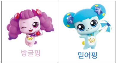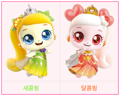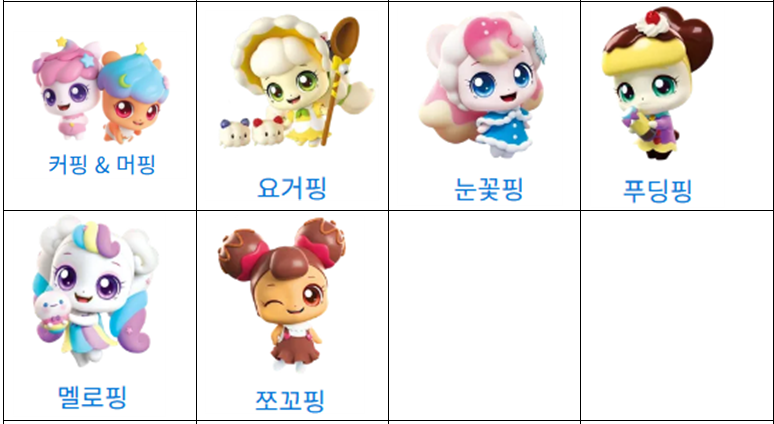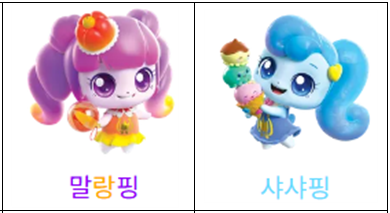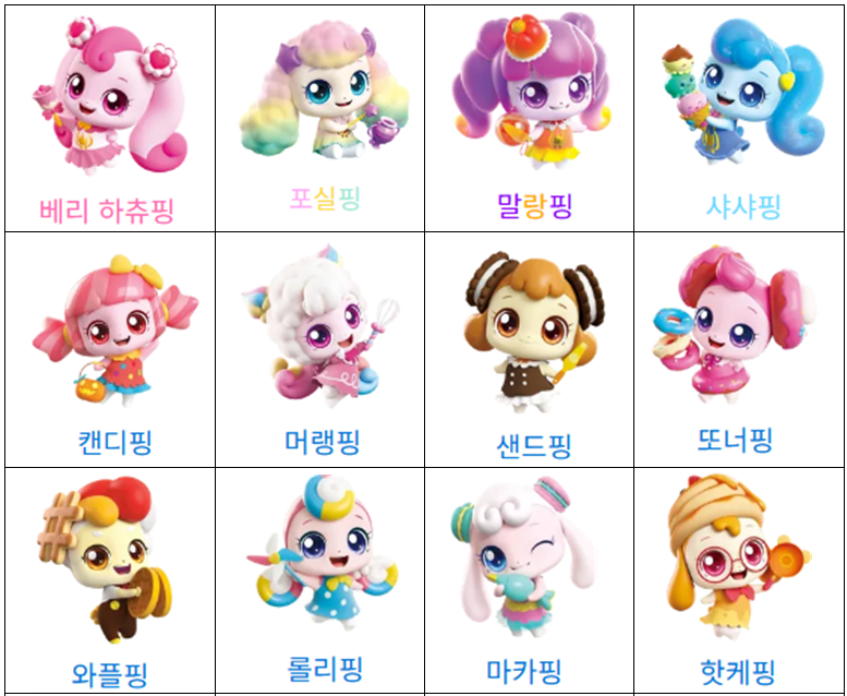 - 달콤핑: 달콤함의 티니핑, 도도하고 새침한 성격, 새콤핑과 단짝, 달콤한 마법으로 주변을 따뜻하게 만듦