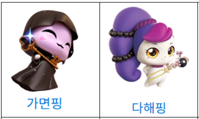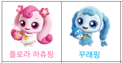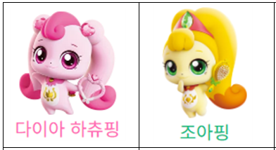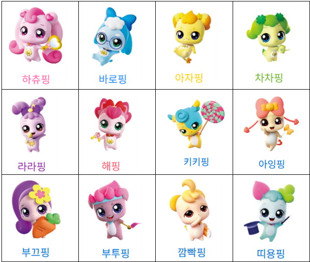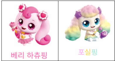 - 달콤핑: 달콤함의 티니핑, 도도하고 새침한 성격, 새콤핑과 단짝, 달콤한 마법으로 주변을 따뜻하게 만듦