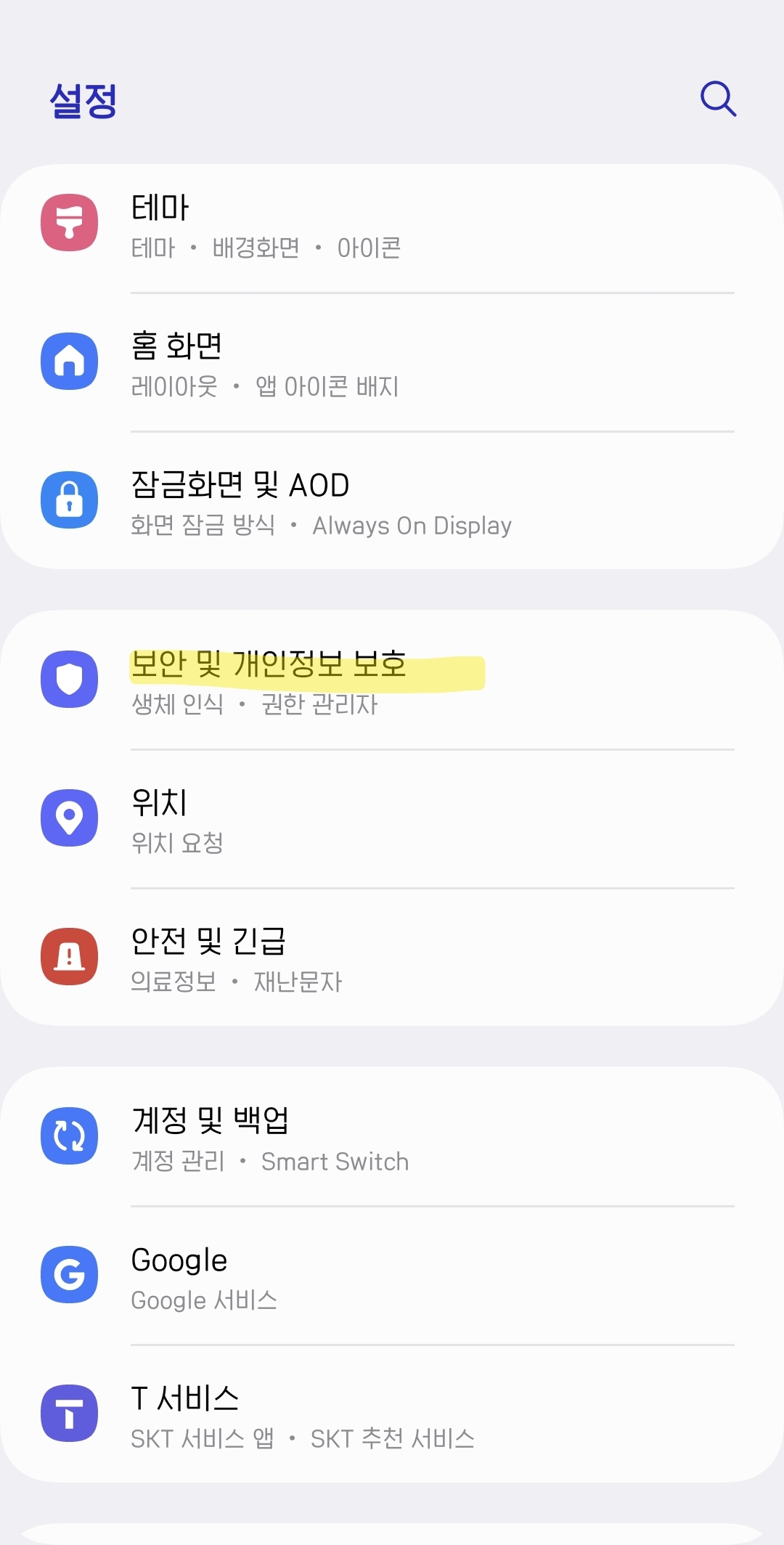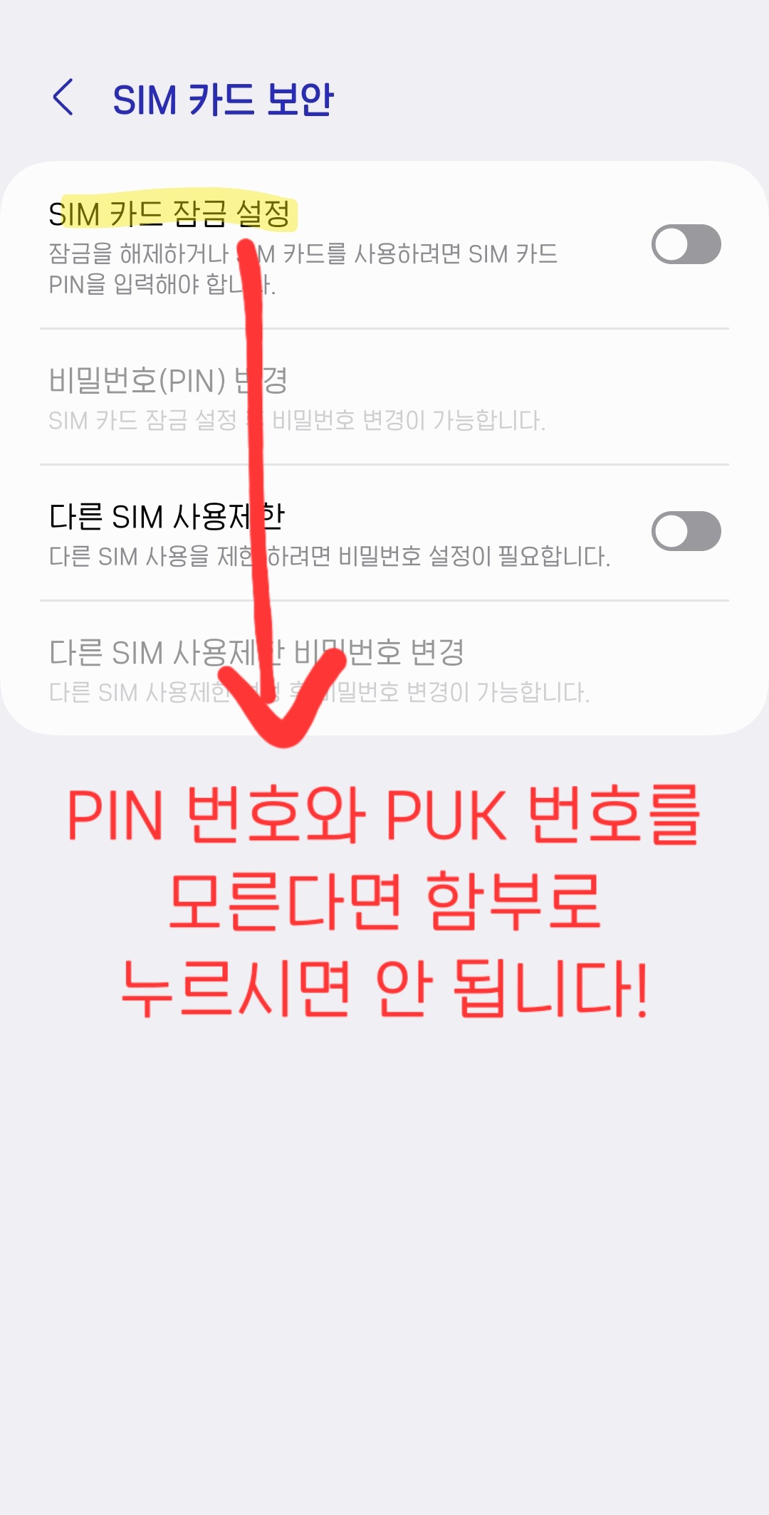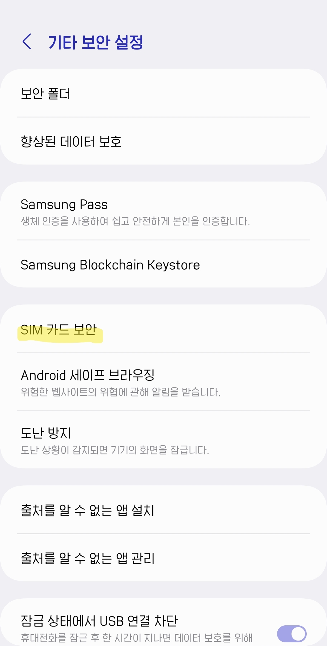 설정 앱 → '보안 및 개인정보 보호' → '기타 보안 설정' → 'SIM 캬드 보안' → 'SIM 캬드 잠금 설정' → 기본 PIN 번호 '0000' 입력 후 원하는 PIN 번호로 변경